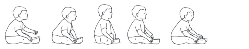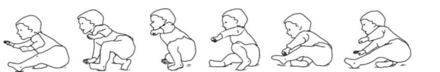 • Scooting o “culeo simétrico”. En posición de sentado, niños y niñas utilizan de manera simétrica la flexión de rodillas y piernas para impulsar su cuerpo hacia adelante. No necesitan apoyar las manos ya que controlan bien el balanceo de tronco.